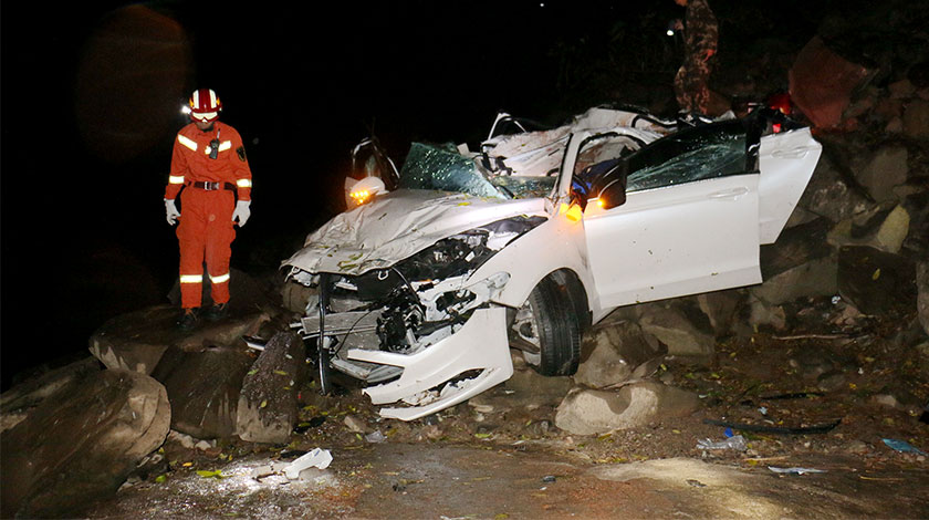 11月27日,四川南江,事故現場。當日,四川巴中南江縣一小轎車行駛至沙河大橋交叉路口時,沖向大橋護欄,從25米高的大橋墜下,車內4人遇難。目前,事故發生原因正在調查中。(中新社圖片/ 唐靖濠 攝)