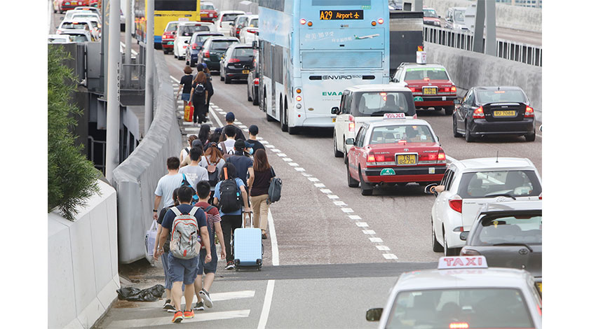 9月1日下午3時30分許,有車輛在香港機場附近道路故意慢駛,令青馬大橋前往香港機場方向道路嚴重擁堵。截至下午5時許,車輛通過青馬大橋需時2小時以上。圖為有市民只好選擇下車拖著行李箱步行前往機場。(香港中通社)