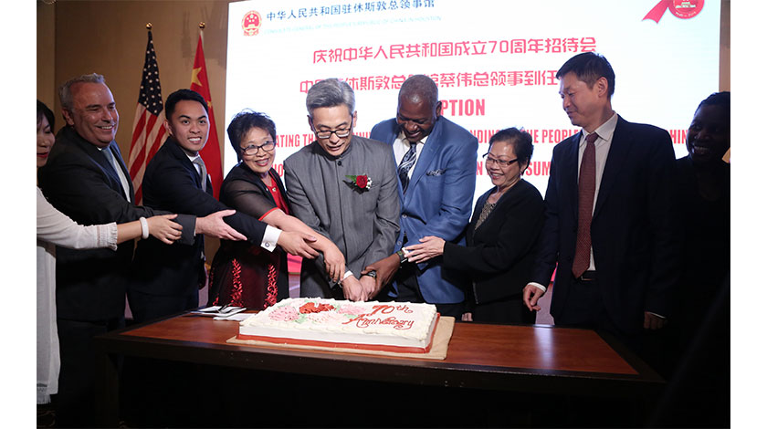 當地時間9月12日晚,中國駐休斯敦總領館舉行慶祝中華人民共和國成立70周年招待會。圖為中國駐休斯敦總領事蔡偉(左五)同與會政要代表一起切蛋糕。(中新社圖片/曾靜寧 攝)