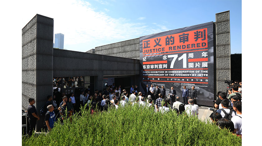 9月18日,南京,開展儀式現場。當日,重現日本侵華戰犯被審實錄的《正義的審判——紀念東京審判宣判71周年圖片展》,在侵華日軍南京大屠殺遇難同胞紀念館正式開展。(中新社圖片/泱波 攝)
