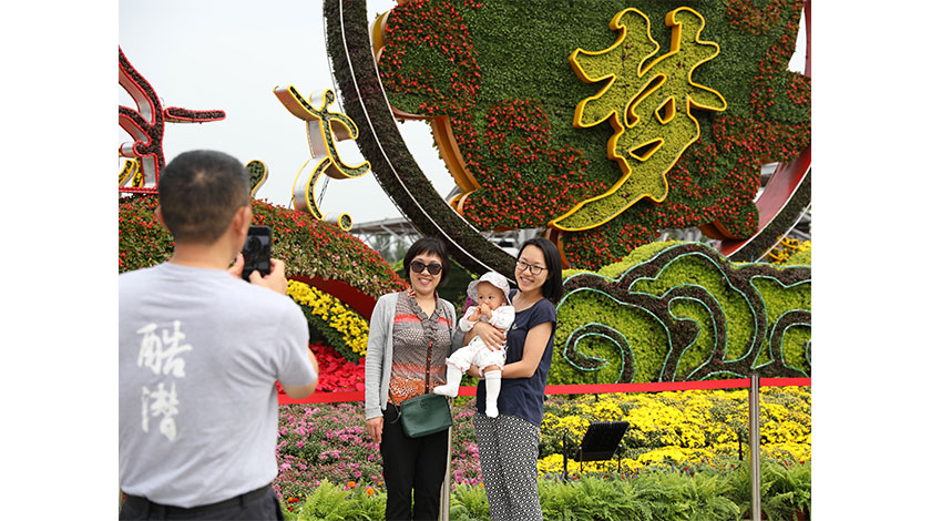 9月19日,民眾在北京奧林匹克森林公園南門的主題花壇前合影留念。隨著『十一』臨近,以國慶為主題設置的花壇成為北京街頭的靚麗風景。(中新社圖片/蔣啟明 攝)