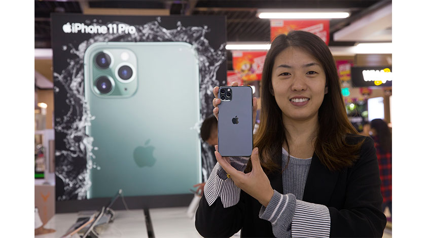 9月20日,山西太原,商場工作人員展示新款iPhone手機。當日,蘋果iPhone 11系列手機全球同步開售。(中新社圖片/ 張雲 攝)