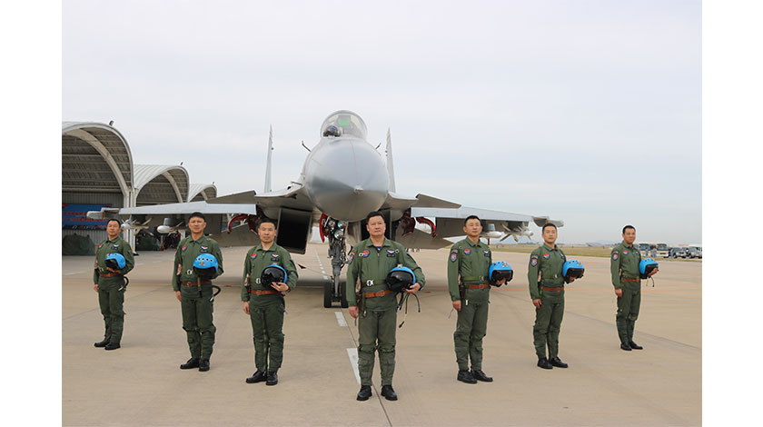 10月1日上午11時許,中國海軍艦載航空兵某部5架銀灰色殲-15艦載戰鬥機組成『V』字形艦載機梯隊,向著天安門上空呼嘯而來。大國『飛鯊』,掠海巡天展雄風。當艦載機梯隊『米秒不差』地飛過天安門上空時,全場響起了經久不息的掌聲。作為航母的艦載機,殲-15戰鬥機自亮相之日就備受各界關注。這是年輕的艦載機部隊第2次飛過天安門上空接受檢閱,同時也是其4年來第5次受閱。圖為9月19日,參加此次閱兵的艦載機梯隊飛行員張葉、盧朝輝、徐愛平、王亮、袁偉和備份機飛行員劉孟濤、鄧偉在殲-5戰鬥機前合影。 (中新社圖片/郭超凱 攝)