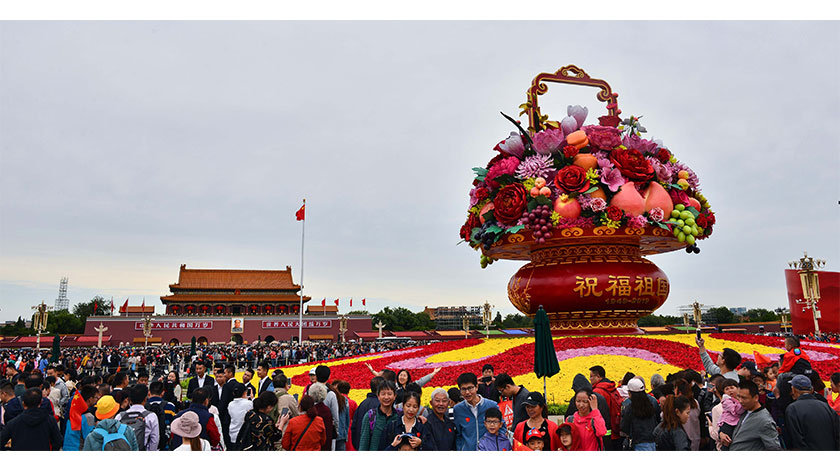 10月4日,北京天安門廣場中心的巨型花籃吸引遊客。當日是國慶假期第四天,眾多遊客來到北京天安門廣場參觀遊覽。(中新社圖片/張興龍 攝)