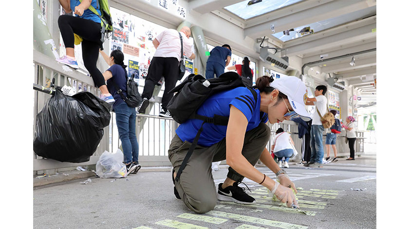 香港市民自發清潔“連儂牆” 撕單張除垃圾(中通社)