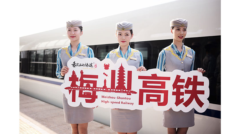 10月11日,梅汕鐵路開通運營,『世界客都』梅州從此結束不通高鐵的歷史。據悉,在開通運營初期,每日有44趟動車組列車往返于梅州至廣州、深圳、汕頭、珠海、宜昌、廈門等地,梅州至廣州、深圳最快僅需3小時25分和2小時52分。圖為列車員歡迎旅客乘車出行。(中新社圖片/陳文 攝)