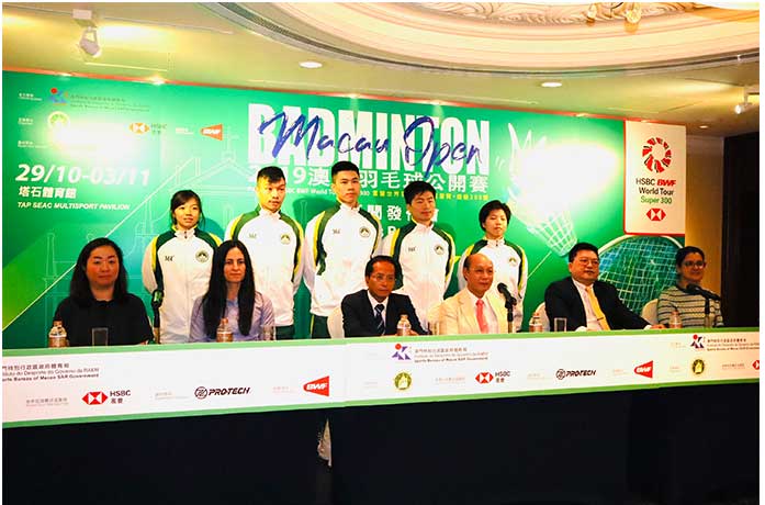 主辦單位日前(11日)在皇都酒店二樓舉行記者會,澳門羽毛球總會會長、兼二零一九澳門羽毛球世界羽聯巡迴賽組織委員會主席鄺達財、體育局廳長鄒國偉、世界羽毛球聯會系列賽事經理蘇菲亞、澳門羽毛球總會副會長、兼二零一九澳門羽毛球世界羽聯巡迴賽組織委員會副主席林德華、澳門羽毛球總會理事長、兼二零一九澳門羽毛球世界羽聯巡迴賽組織委員會副主席馬嘉美、澳門羽毛球總會、兼二零一九澳門羽毛球世界羽聯巡迴賽組織委員會秘書長黃家瑛等主持及介紹賽事詳情。