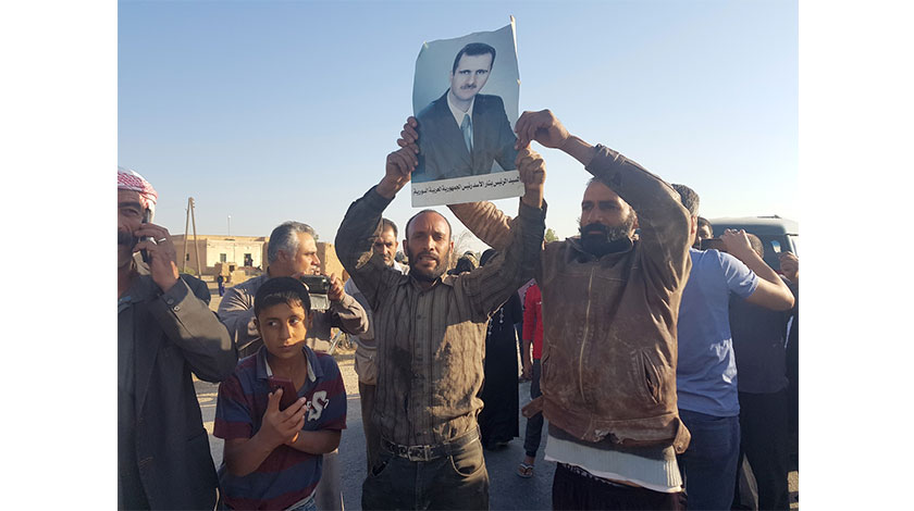10月14日,在敘利亞北部哈塞克省,當地民眾手持敘利亞總統巴沙爾•阿薩德畫像,慶祝敘政府與庫爾德武裝達成協議。