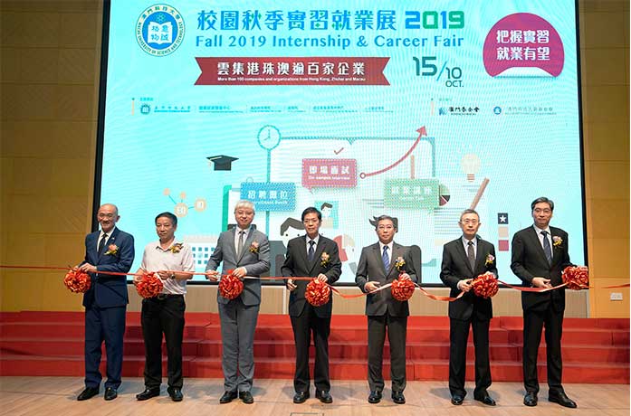 【特訊】澳門科技大學日前成功舉行「校園秋季實習就業展2019」,吸引了逾百家珠港澳企業參與。出席的主禮嘉賓有澳門科技大學林志軍副校長、龐川副校長、鄺應華副校長、珠海市人力資源和社會保障局人才資源與就業服務中心曾亞興副主任、澳科大資訊科技學院張渡院長、酒店與旅遊管理學院吳國民院長、人文藝術學院張志慶院長等。澳科大管理層向出席的近百家企業致送由畢業生設計的紀念品,場面熱鬧。