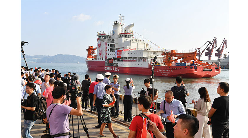 10月15日下午,中國第36次南極科學考察隊暨『雪龍2』號船從廣東省深圳市蛇口郵輪母港啟航,前往南極執行科考任務。(中新社圖片/ 陳文 攝)