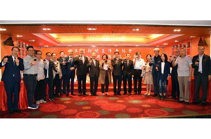 【特訊】澳門新聞工作者協會昨晚舉行聯歡餐會,慶祝新中國成立七十周年暨會員服務年資獎頒獎禮,行政長官崔世安出席主禮並致詞,讚揚澳門新聞界作為政府與居民之間的溝通橋樑,發揮了重要的作用。記協會長陸波表示,該會將秉持前輩們的創會宗旨,不忘初心,牢記使命,繼續為澳門新聞同業的發展、為澳門社會的繁榮穩定作出新的貢獻。