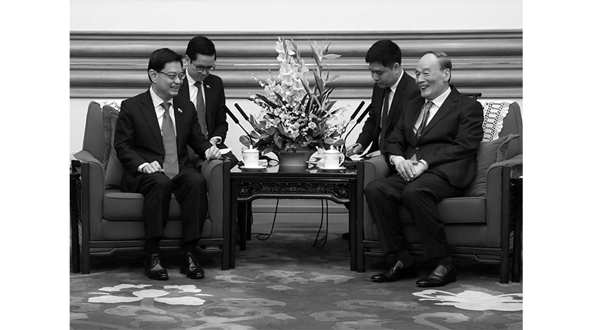 10月17日,中國國家副主席王岐山在北京中南海會見新加坡副總理兼財政部長王瑞傑。(中新社圖片/宋吉河 攝)