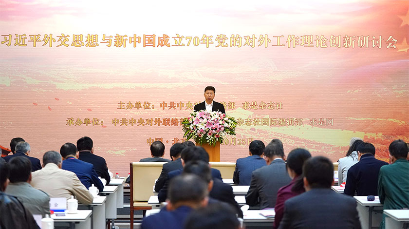 10月25日,由中共中央對外聯絡部和求是雜誌社聯合舉辦的『習近平外交思想與新中國成立70年黨的對外工作理論創新研討會』在北京舉行。圖為中共中央對外聯絡部部長宋濤出席開幕式並致辭。(中新社圖片/張興龍 攝)