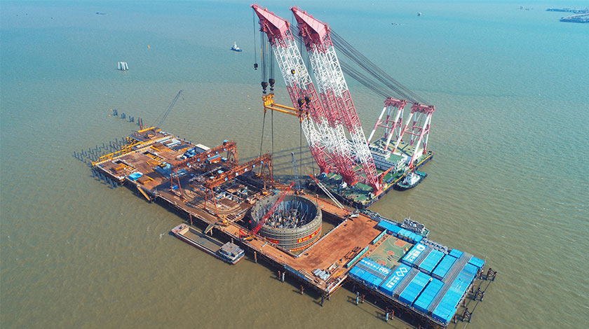 11月7日,廣東省交通集團發佈消息稱,深中通道項目伶仃洋大橋西索塔首個鋼吊箱實現下放。伶仃洋大橋建成後,將成為全球最高的海中大橋。圖為深中通道伶仃洋大橋西索塔1800噸鋼吊箱下放。 (中新社圖片/沈衛東 攝)