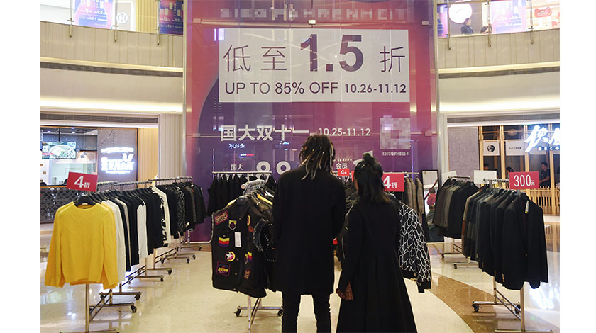 11月10日,杭州一家商場打出『低至1.5折』的促銷廣告。『雙十一』購物節前夕,浙江杭州眾多實體商家掀起促銷熱潮,搶占線下消費市場。 (中新社圖片/ 王剛 攝)