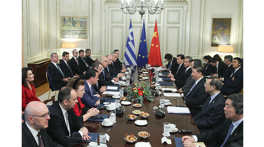 當地時間11月11日,中國國家主席習近平在雅典同希臘總理米佐塔基斯會談。 (中新社圖片/盛佳鵬 攝)