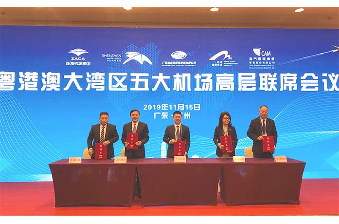 【特訊】2019年粵港澳大灣區五大機場高層聯席會議於11月14-15日在廣州召開,澳門國際機場專營股份有限公司(CAM)執行委員會主席鄧軍博士率團參加。今屆會議由廣東省機場管理集團有限公司輪值主辦,五大機場以“落實《粵港澳大灣區發展規劃綱要》,促進世界級機場群建設”為主題,簽署合作備忘錄。面對灣區巨大的市場潛力和發展機遇,交流分享各機場基礎設施建設情況,攜手推進世界級機場群建設。