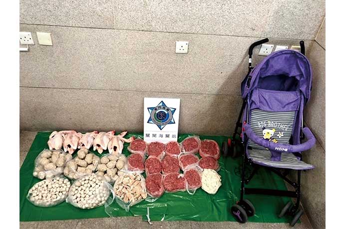 案件發生於本月20日上午,關閘口岸海關人員在入境旅客檢查區執勤期間,發現一名女子快速推行嬰兒車通過入境旅客通道,關員察覺嬰兒車載物品沉重,並有毛氈覆蓋於表面,遂對其進行截查。經檢查後發現嬰兒車內及背後掛鈎上載有大量未經檢疫食材,包括牛肉、已宰雞隻及其他肉類製品合共31.5公斤。