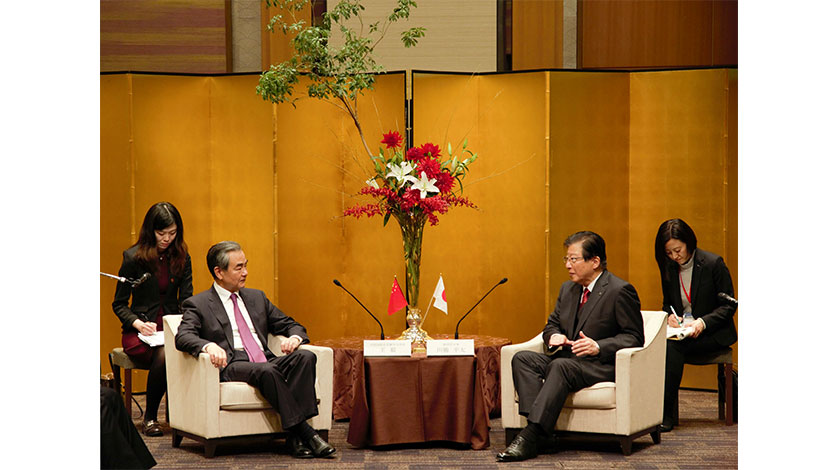 11月24日,中國國務委員兼外交部長王毅(左)在靜岡會見日本靜岡縣知事川勝平太。(中新社圖片/呂少威 攝)