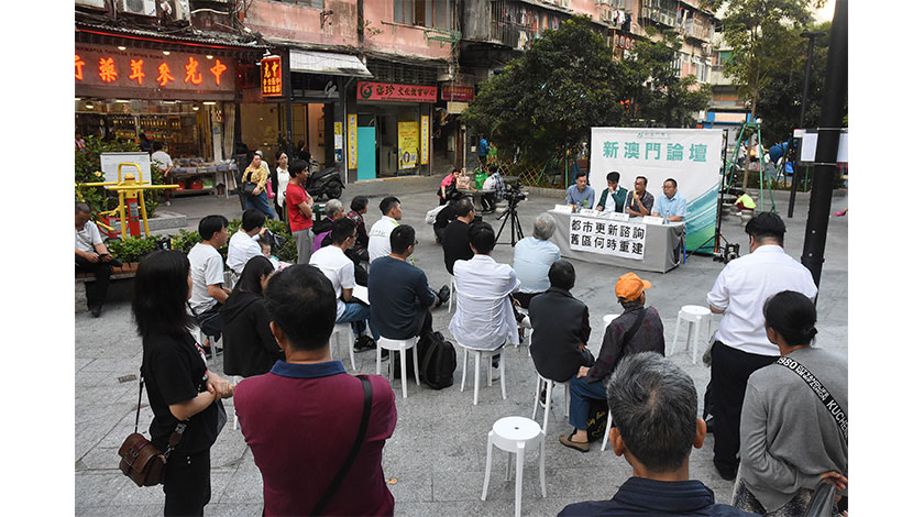 新澳門學社昨在祐漢新村第四街休憩區舉辦「新澳門論壇」,邀嘉賓和街坊探討都市更新和舊區重建。