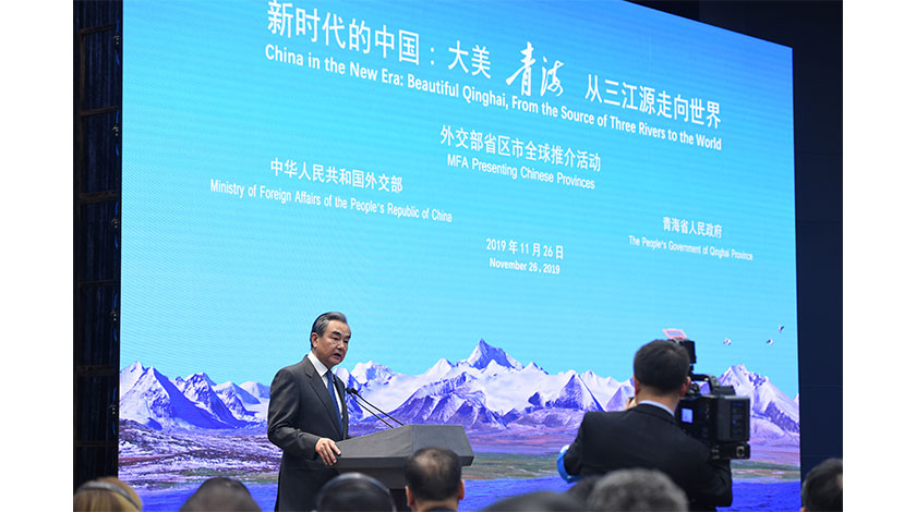 11月26日,以『新時代的中國:大美青海 從三江源走向世界』為主題的中國外交部青海全球推介活動在北京舉行,中國國務委員兼外交部長王毅出席並致辭。(中新社圖片/侯宇 攝)