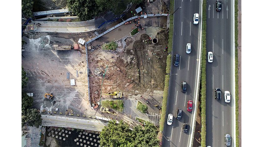 12月2日,為避免廣州地鐵十一號線沙河站施工區域地面塌陷區域進一步擴大,工作人員對塌陷區域進行局部回填,加固邊坡,防止再次塌方。同時,工作人員在塌陷區域安裝鋼護筒,形成救援通道,救援人員可從鋼護筒向下探挖尋找被困人員。圖為航拍地陷事故現場。(中新社圖片/ 吳振元 攝)