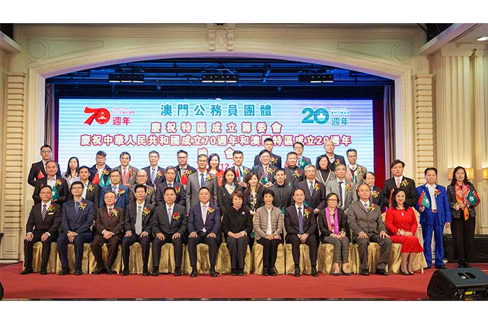 【特訊】為慶祝中華人民共和國成立70周年及澳門特區成立20週年,澳門公務員團體慶祝特區成立周年活動籌委會(簡稱“公慶會”)於萬豪軒舉行“雙慶”聯歡晚會,經濟財政司司長梁維特、中央人民政府駐澳門特別行政區聯絡辦公室副秘書長兼社工部部長黃華蓋、行政法務司司長辧公室主任丘曼玲、行政會委員何雪卿和鄭志強、行政公職局局長高炳坤、治安警察局局長梁文昌等出席了晚會。