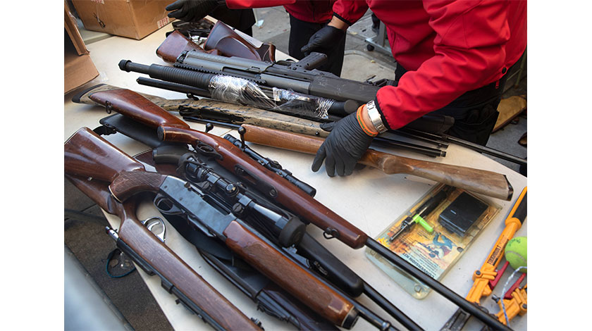 當地時間12月14日,舊金山警察局和當地組織『United Playaz』舉辦槍支回購活動,鼓勵槍主以武器換現金,營造安全的社區環境。警方在活動結束後表示,當天共回收318把各類槍支。圖為警方整理回收的槍支。(中新社圖片/劉關關 攝)