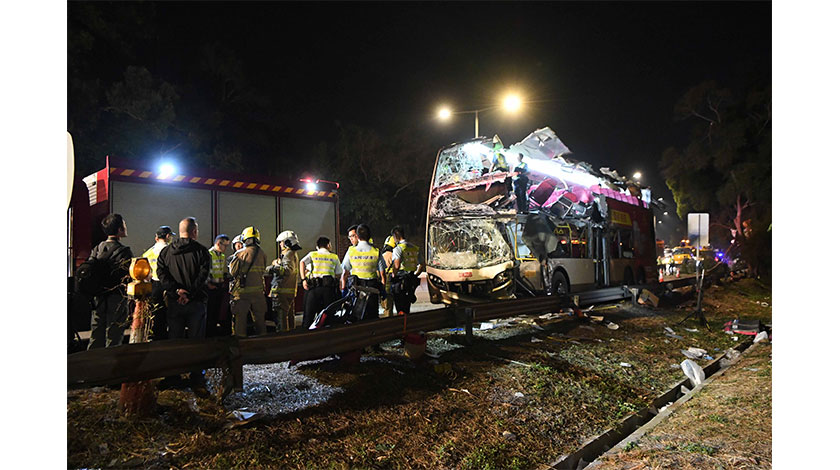 12月18日,香港一輛九巴雙層巴士在粉嶺公路發生致命交通意外,死亡人數增至6人,約30多人受傷。事發在下午4時許,一輛雙層巴士懷疑撞樹,上層左邊車身被削開一半。圖為事發現場。(香港中通社)