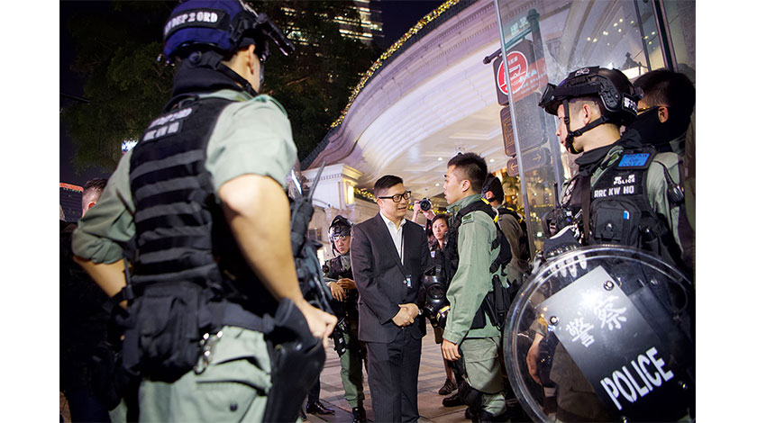 香港警務處處長鄧炳強(中)到尖東一帶巡視,又和在平安夜當值的警務人員握手交談。(香港中通社)