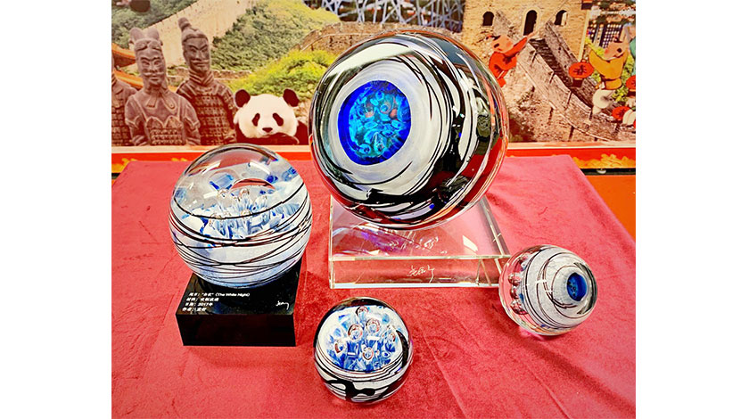 這次贈送東京中國文化中心的玻璃作品題為「白夜」創作於2018年。作品曾在2018年5月至11月間在侵華日軍南京大屠殺遇難同胞紀念館舉辦的「痛的沈澱與超越」國際當代藝術展中展出。吳為山教授專門為此次展覽撰寫了賀信。這件作品整體通體透亮,唯美而神秘,以玻璃特殊的材料特性表達出透明、輕盈、詩意的精神性色彩。作品呈現的藍色,幽深如海洋、深邃如星空。玻璃中部升騰的氣泡是生命起源的初始型態,象徵人內心的精神世界的自由和無限探求。球體外部纏繞著細密的黑線,向上逐漸減少,象徵著人從思想禁錮中逐步實現精神的昇華與解脫。作品寓意著寰宇之下,人的心靈是比海洋、天空更遼闊的。人與人之間因彼此諒解而化解隔閡,相互理解而尊重,而獲得心靈的釋然,美美與共,大愛無疆。作者透過當代性的玻璃藝術語言和展覽形式表達人類普遍的情感價值,在富有美感的藝術體驗中引發人們對於現代文明中戰爭的反思,祈願和平。