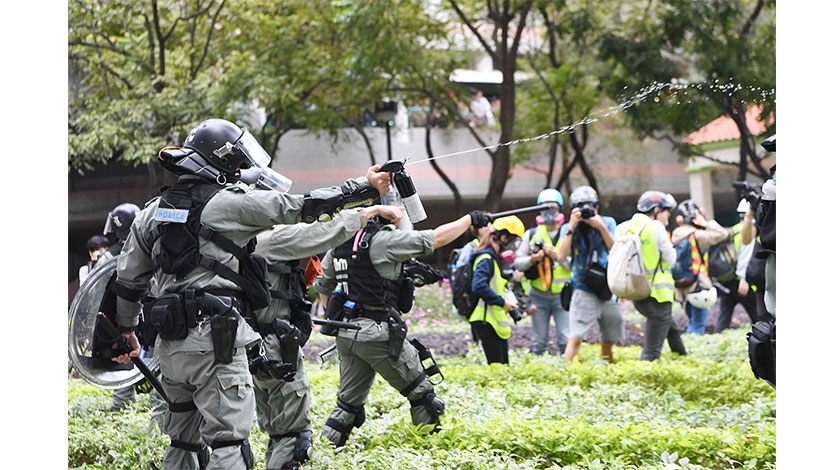 1月5日下午四時許,防暴警察及便衣警員於上水廣場一帶拘捕多名示威者。在較早時間,警方稱由於示威者偏離遊行路線,有關集結屬非法集結,要求他們散去。(香港中通社)