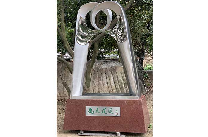 《九九蓮環》高2.1米,闊1.5米,重250公斤,底座為印度紅大理石。雕塑匠心獨運,寓意深刻:兩個相對 的“9”字猶如世紀之門;“9”字上端巧妙地交織緊扣,構成一朵含苞待放的白蓮花,寄寓對澳門回歸的喜悅和祝福。