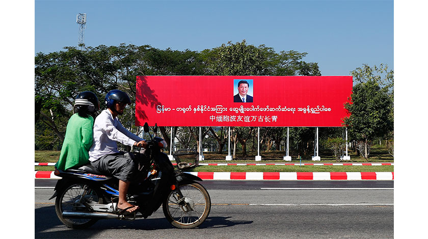 當地時間1月16日,緬甸首都內比都,騎車人經過『中緬胞波友誼萬古長青』標語。應緬甸聯邦共和國總統溫敏邀請,中國國家主席習近平將於1月17日至18日對緬甸進行國事訪問。(中新社圖片/盛佳鵬 攝)