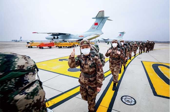2月2日,中國空軍8架大型運輸機相繼從瀋陽、蘭州、廣州和南京飛抵武漢天河機場,向武漢緊急空運795名軍隊支援湖北醫療隊隊員和58噸物資。 (中新社圖片/ 陳曉東 攝)