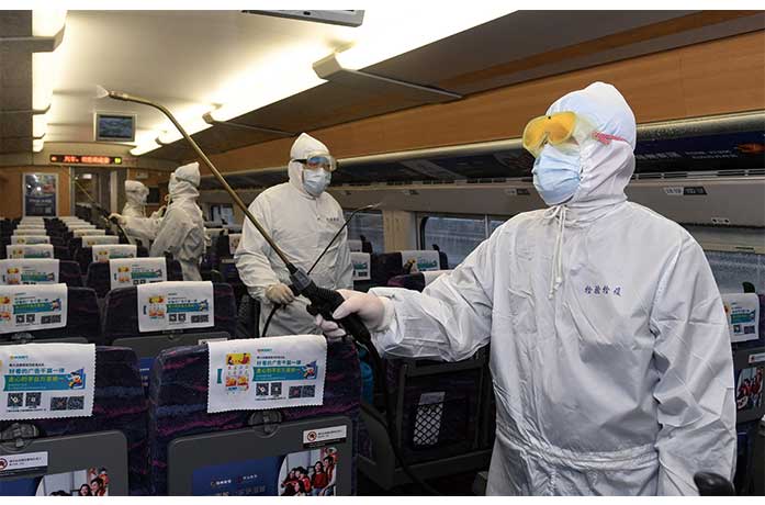 廣西多措並舉抗擊新冠肺炎疫情 中國鐵路南寧局集團有限公司疾控中心工作人員對一列動車實施消殺作業(2月6日攝)。 新冠肺炎疫情發生以來,廣西加強防疫宣傳和防控力度、加大防疫物資生產並多方籌措物資支援湖北,多措並舉抗擊疫情。 (新華社記者陸波岸攝)