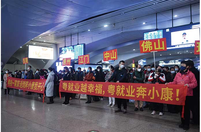 2月19日15時55分,從廣西百色站發車的D4508次列車抵達廣州南站,運送756名務工人員返崗。據悉,受疫情影響,今年春節後廣東短期缺工現象比往年更為突出,該省正持續與雲南、廣西、四川等省(區)聯合組織“點對點”返粵返崗專列,滿足企業復產的用工需求。圖為務工人員按不同目的地集合。 (中新社圖片/ 姬東 攝)