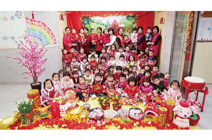 「新春團拜」活動旨在提倡靈活的培育方式,將學習融入幼兒日常生活,並以活潑生動的模式向幼兒灌輸節日的知識,藉此培養他們的感知能力,讓他們認識傳統節日及習俗。當日,幼兒在敎師的協助下,繪畫出色彩鮮麗的桃花樹,教師與幼兒們一起擺放賀年全盒食品,懸掛賀年飾物,張貼恭賀揮春;教師向幼兒講解春節的由來和故事,增加幼兒對節日及中國傳統文化的認識,幼兒們還穿上色彩鮮艷奪目的中國傳統服飾,學習各種祝賀語句,互相祝賀拜年及品嚐各式各樣的賀年食品、糖果,教師更讓幼兒嘗試敲打鑼鼓、舞動獅頭,接觸新年傳統風俗的事物,托兒所內洋溢著濃厚的節日氣氛,場面溫馨熱鬧,歡笑聲處處。