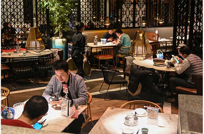 2月21日晚,顧客在廣州天河區一餐館內吃晚飯。當日,廣州市防控新型冠狀病毒肺炎疫情工作指揮部辦公室發佈廣州市各區新型冠狀病毒肺炎疫情分區分級表,越秀、海珠、荔灣、天河、白雲、黃埔、花都、番禺被劃分為Ⅲ級,南沙、從化、增城被劃分為Ⅳ級。分級為Ⅲ級防控區的縣(市、區),餐飲經營單位可在滿足指引的條件下恢復堂食服務;分級為Ⅳ級防控區的縣(區),餐飲經營單位可開放堂食服務。(中新社圖片/ 陳驥旻 攝)
