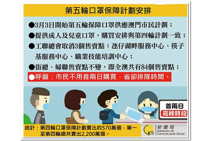 口罩計劃對象為本澳永久及非永久居民、持藍咭人士,憑有關證件每個可購十個成人口罩,而滿三至八周歲的兒童則可選五個兒童口罩和五個成人口罩,或全數十個成人口罩。售賣點有八十四個,包括各衛生中心及衛生站、衛生局協議藥房,以及三個協議社團售賣點。取消的為氹仔湖畔綜合服務中心、工聯筷子基家庭及社區綜合服務中心、工聯職業技能培訓中心。當局抗疫專頁(www.ssm.gov.mo/apps1/PreventCOVID-19/ch.aspx#clg17311)有各售賣點詳情及口罩存量。