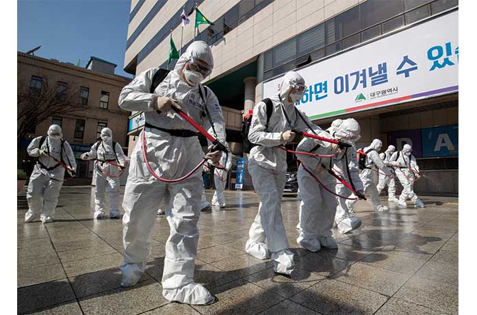 3月2日,在韓國大邱市廳,韓國陸軍支援隊成員進行消毒防疫