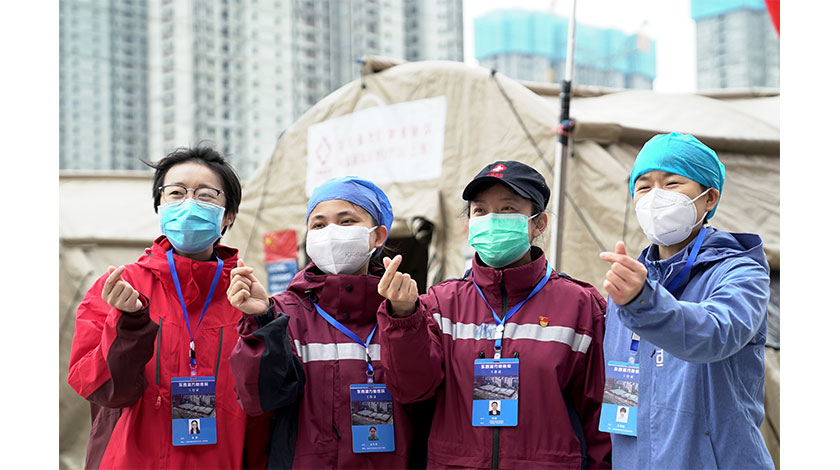 3月8日,武漢客廳方艙醫院的醫療隊隊員合影留念。當日,武漢客廳方艙醫院正式休艙。(新華社記者 饒力文 攝)