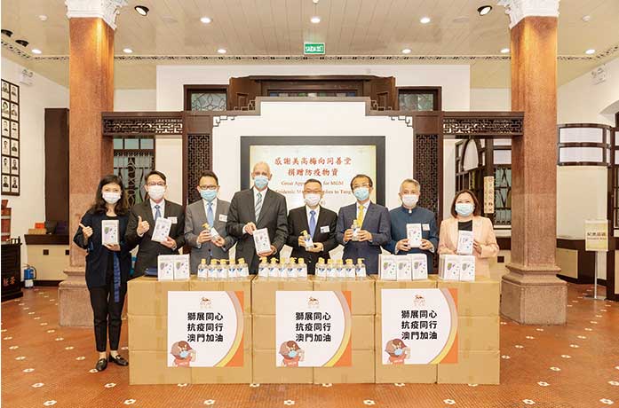 交贈儀式上,由美高梅中國控股有限公司首席執行官及執行董事簡博賢以及總裁、首席戰略官及董事馮小峰、美高梅人力資源行政副總裁余婉瑩及公共及社會事務副總裁王如茵,將防疫用品贈予同善堂,由同善堂值理會主席崔世平、值理李傑興、蔡明威及李俊鳴代表接收。