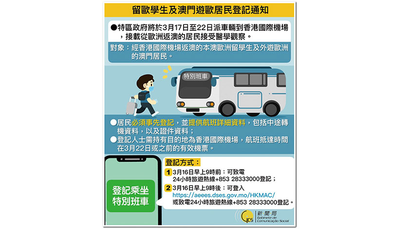 旅遊局執照及監察廳廳長陳露表示,香港已經宣佈,過去十四日曾到歐洲神根地區抵港人士 (包括澳門居民) 都需要接受十四天的醫學檢疫措施。為此,政府決定派車到香港機場接載澳門居民和學生回澳,接載日期為三月十七日至廿二日。