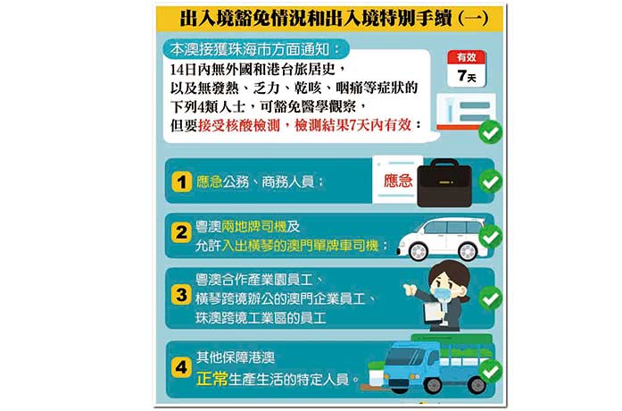 昨午近五時,珠澳聯防聯控澳方工作組發出公告:珠海市新型冠狀病毒肺炎疫情防控指揮部決定,對十四日內沒有外國和香港、臺灣地區旅居史,以及沒有發燒、乏力、乾咳、咽痛等症狀的人士,暫不實施集中醫學觀察,但全部實行核酸檢測,並對其嚴格加強全流程健康管理。