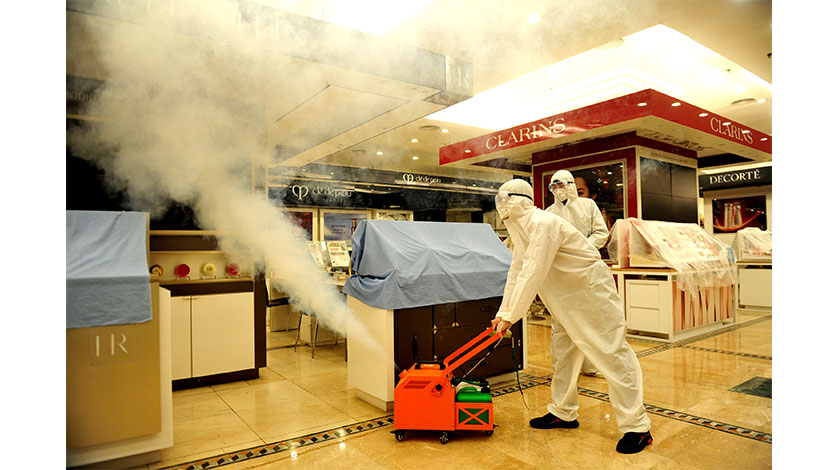 3月29日,消殺人員在武商廣場進行消毒工作,為恢復營業做準備。從30日起包括武商、中商、漢商武漢三大商業集團旗下購物中心和楚河漢街等商業網點將恢復營業。(中新社記者 張暢 攝)