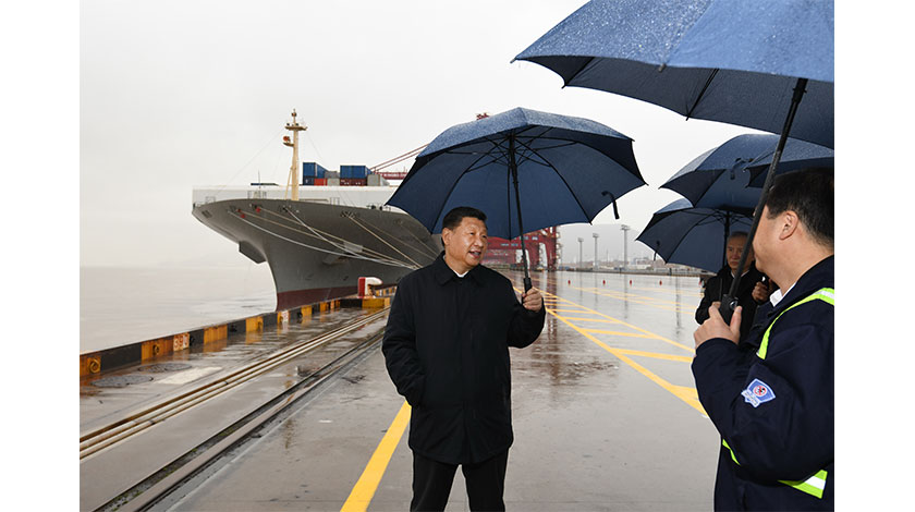 3月29日,中共中央總書記、國家主席、中央軍委主席習近平在浙江考察調研。這是習近平在寧波舟山港穿山港區碼頭了解港口復工復產情況。 (新華社記者 申宏 攝)