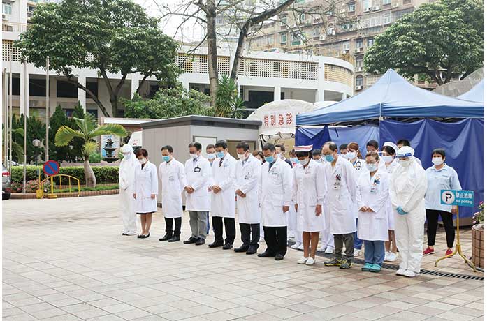 【特訊】4月4日是全國性哀悼日,鏡湖醫院一眾領導出席默哀活動。當日上午 10 時正,院領導帶領門急診、住院部全體工作人員默哀 3 分鐘,向全國各族人民對抗擊新冠肺炎疫情鬥爭犧牲烈士和逝世同胞表達深切哀悼,出席活動的院領導有鏡湖慈善會副理事長、秘書長兼醫院行政院長吳培娟,院長馬學章,副院長陳泰業、張振榮,院長助理潘寶全、李鵬斌、黎啟盛、祁維,護理部主任王靜華等人員。