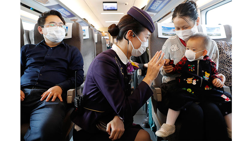 5月7日,上海虹橋至北京南的G2次列車上,中國鐵路上海局集團有限公司上海客運段高鐵一車隊列車長封盛與小旅客打招呼。隨著疫情防控形勢持續向好,長三角去往北京等方向客流量增大,中國鐵路上海局集團有限公司恢復開行多趟客車,以滿足旅客出行需求。(中新社記者 殷立勤 攝)