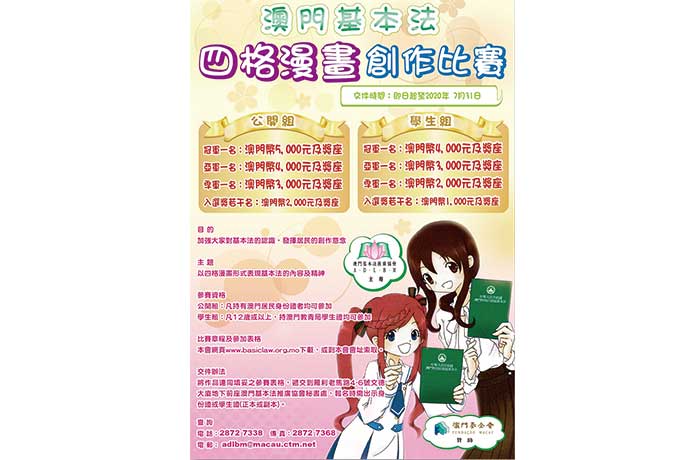 【特訊】為了推廣基本法的重要性,發揮大家的創作意念,藉着四格漫畫形式廣泛宣傳基本法,澳門基本法推廣協會今年繼續舉辦“基本法四格漫畫創作比賽”,以加深市民對基本法的認識,歡迎市民踴躍參加。